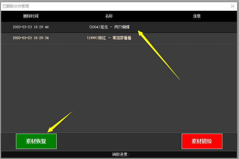 注:恢復后的素材會在原有分類中出現,若此歌曲被劃分到“包”中,它將脫離和“包”的關系。